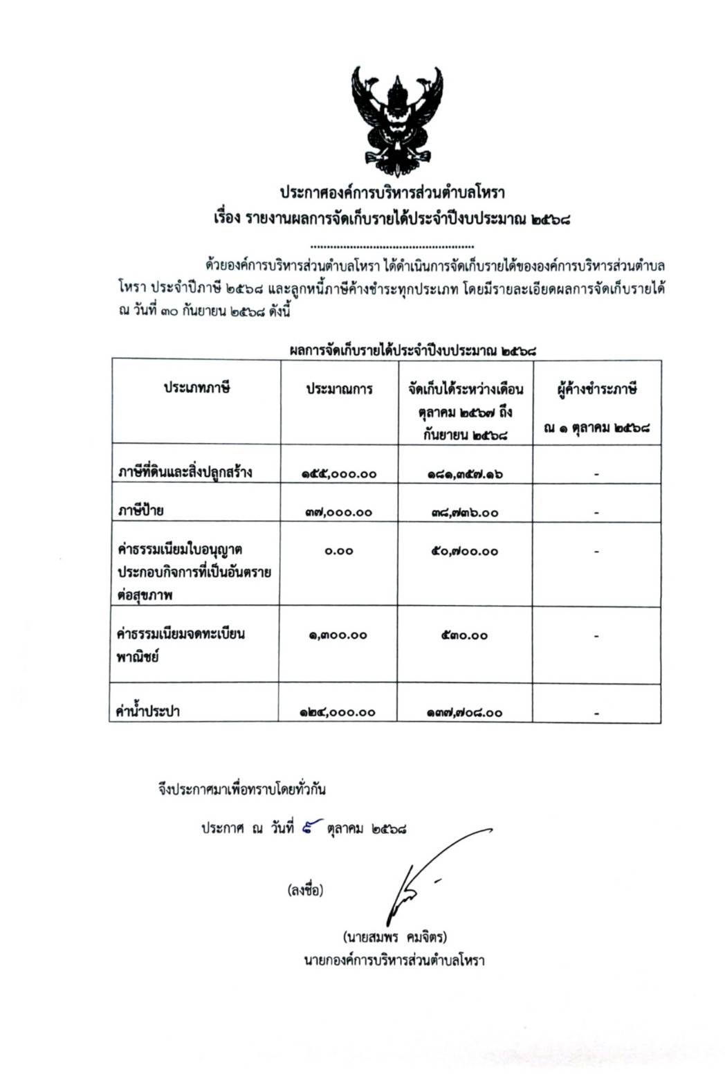 ชื่อเรื่อง : ประกาศองค์การบริหารส่วนตำบลโหรา เรื่องรายงานผลการจัดเก็บรายได้ประจำปีงบประมาณ 2568